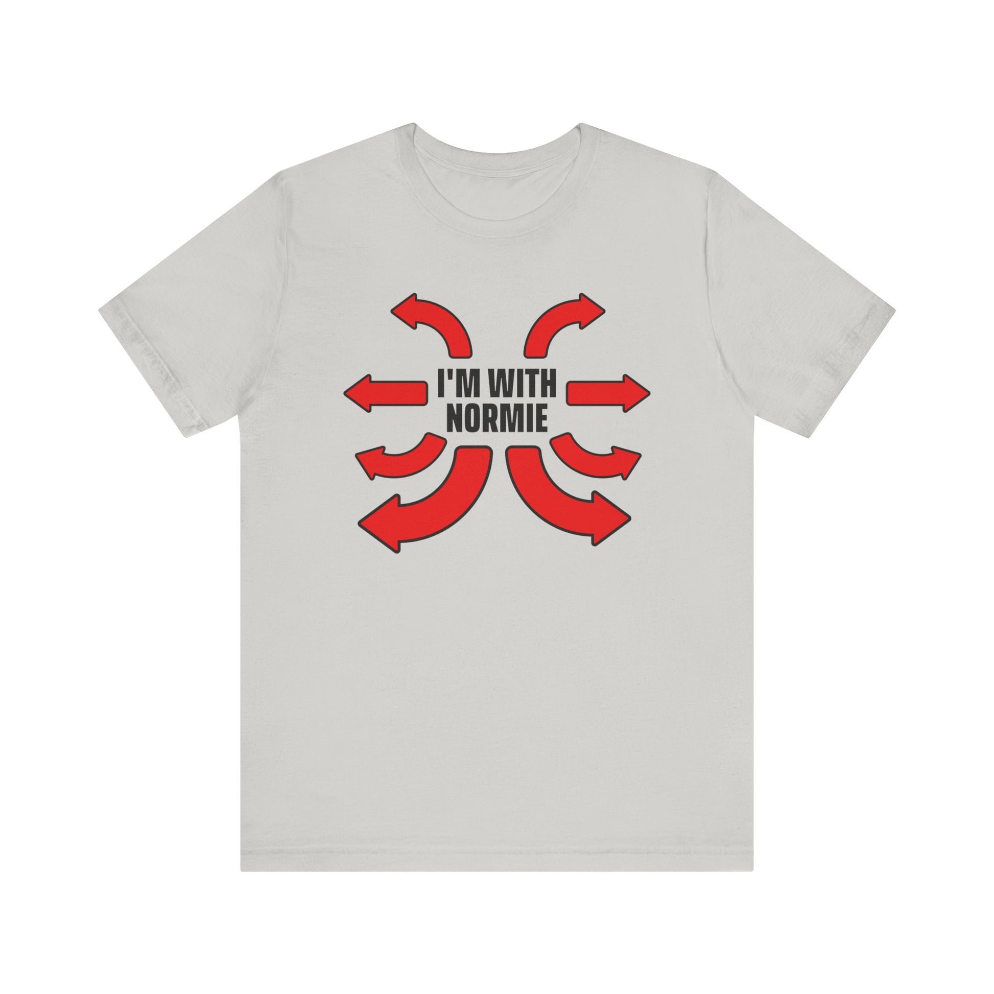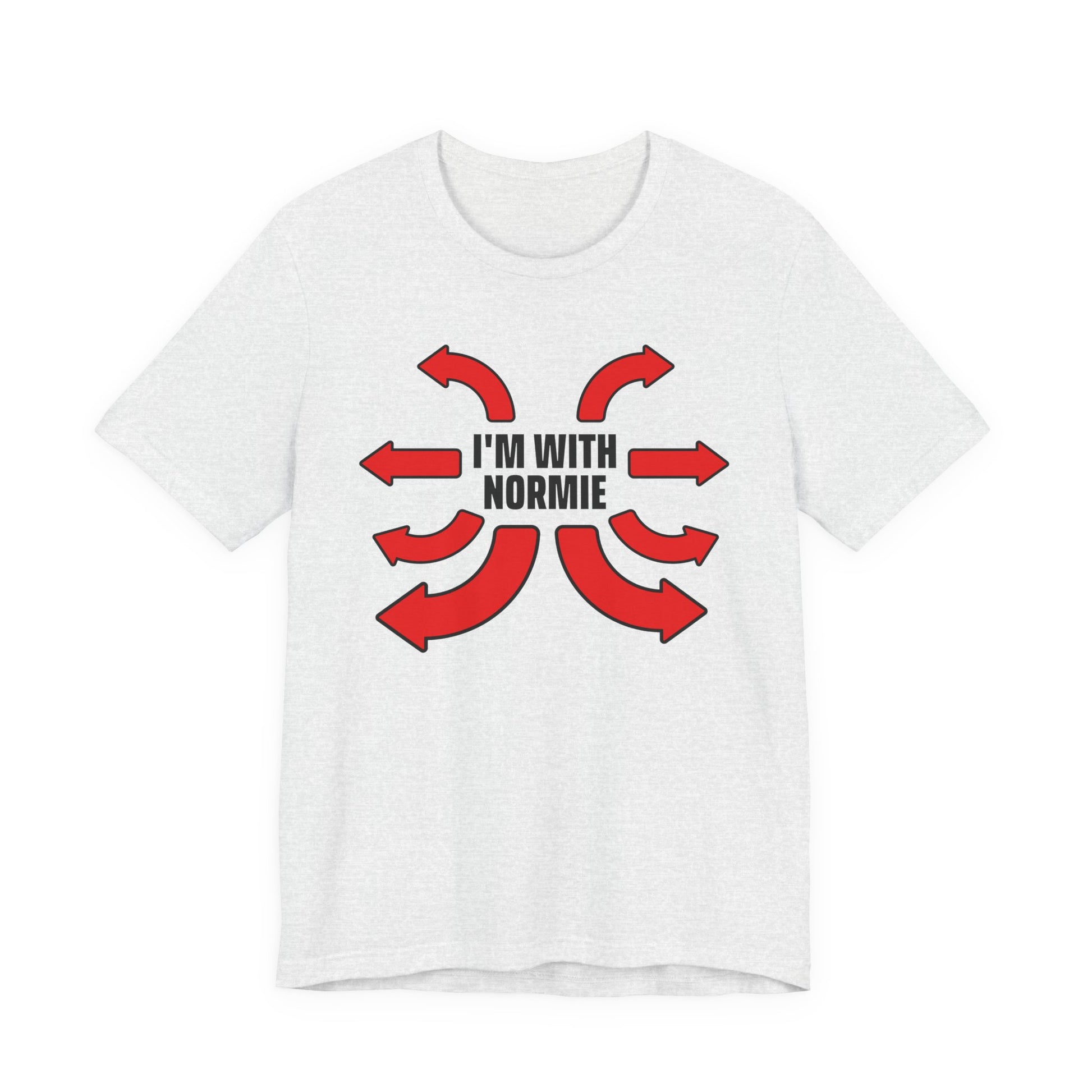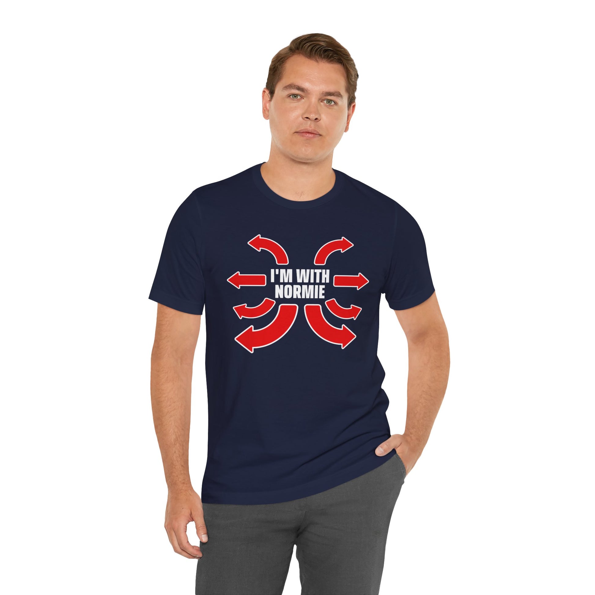 A modern twist on the classic "I'm with Stupid" t-shirt, this Unisex Jersey Short Sleeve Tee features the phrase "I'm with Normie" surrounded by arrows pointing to all the normies around you. Perfect for casual wear and for those with a sense of humor, this tee is relevant for everyday wear and can be a great conversation starter during gatherings and parties. Good times.