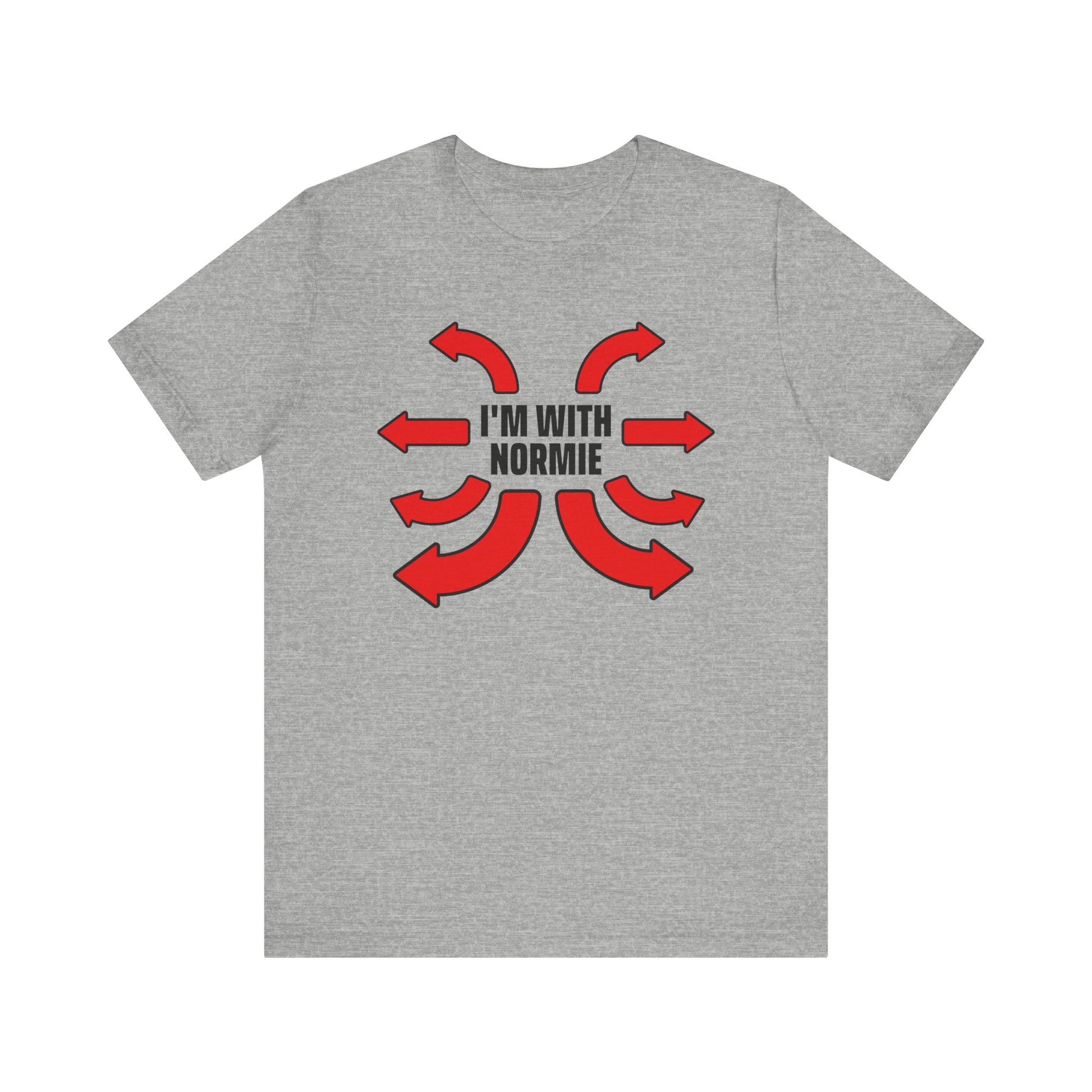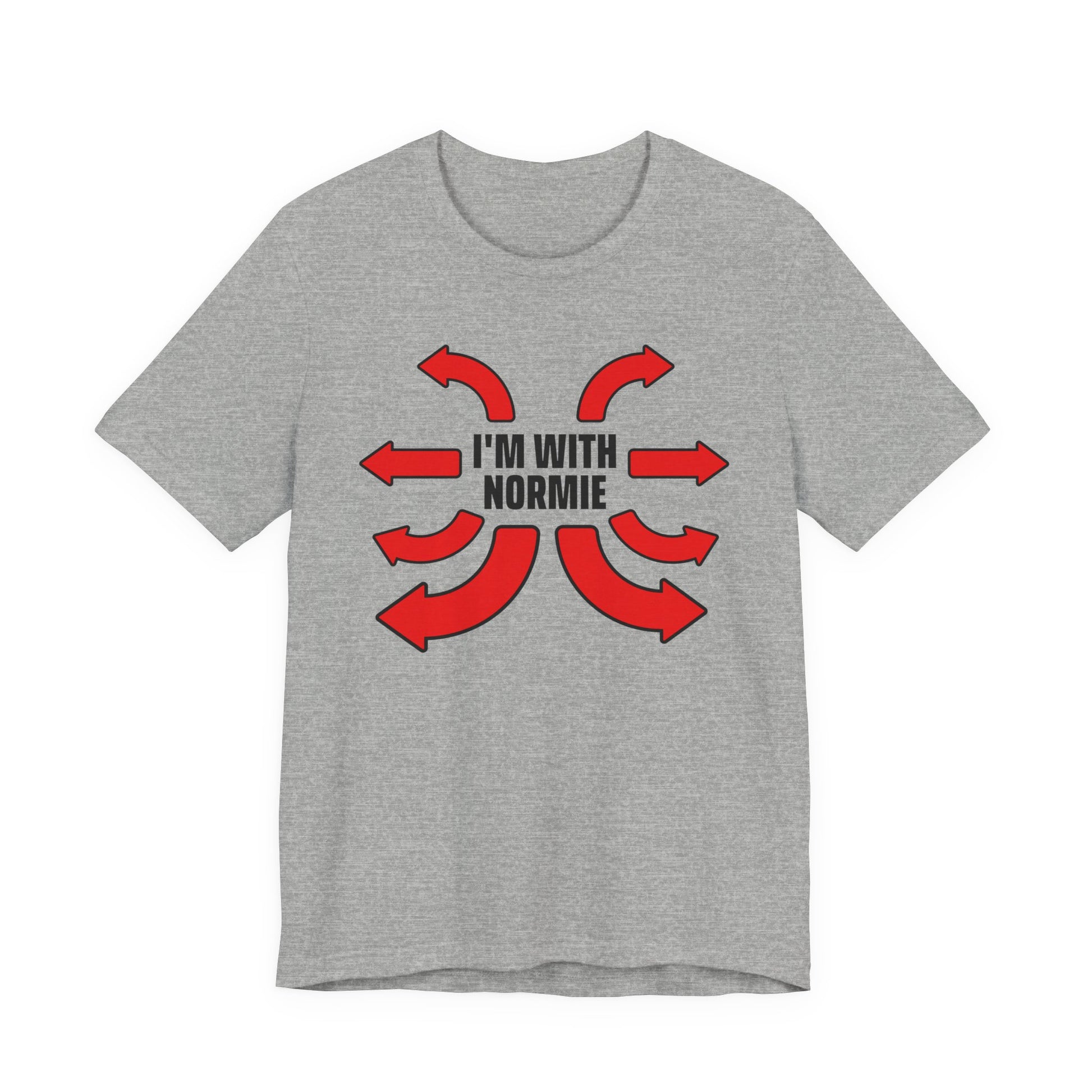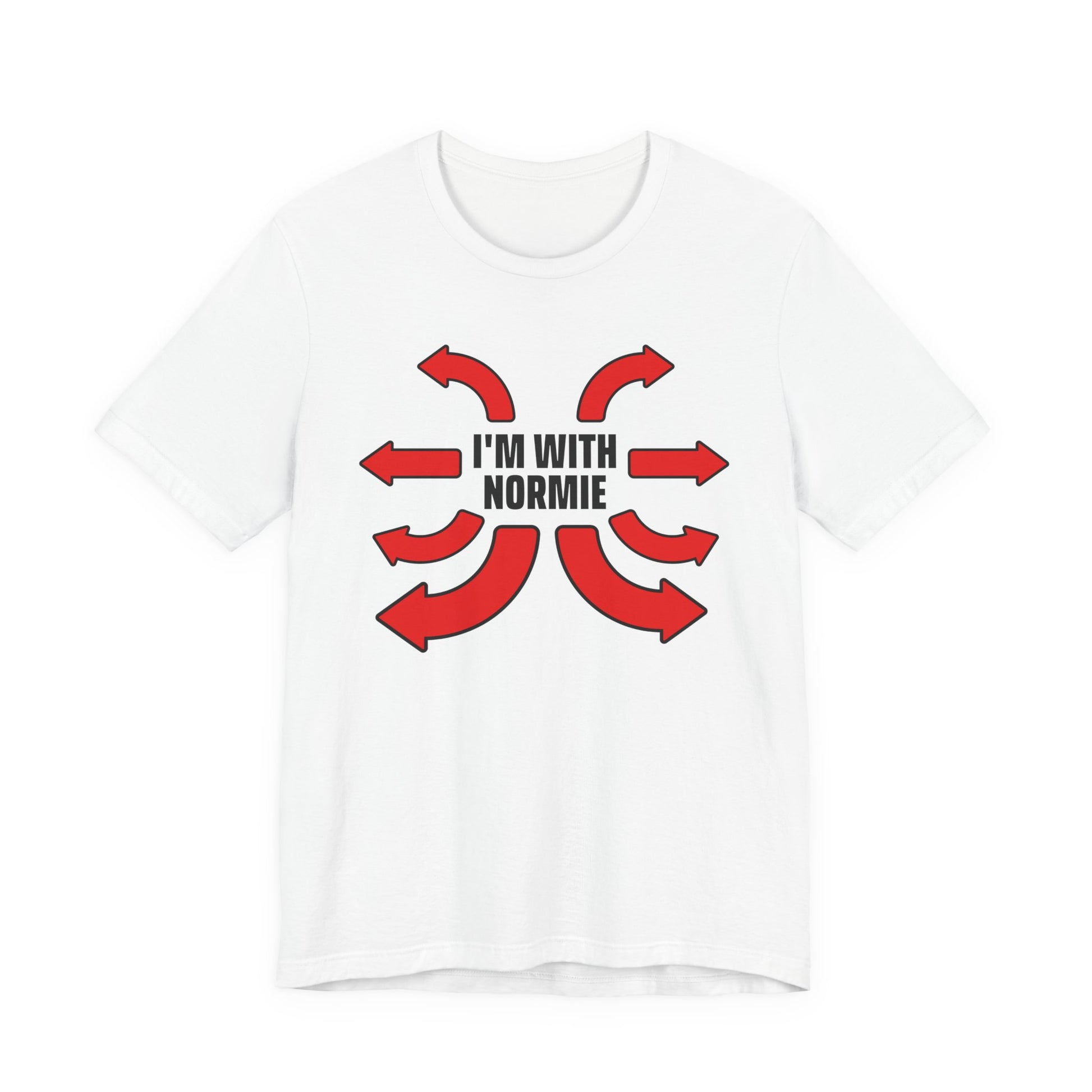 A modern twist on the classic "I'm with Stupid" t-shirt, this Unisex Jersey Short Sleeve Tee features the phrase "I'm with Normie" surrounded by arrows pointing to all the normies around you. Perfect for casual wear and for those with a sense of humor, this tee is relevant for everyday wear and can be a great conversation starter during gatherings and parties. Good times.