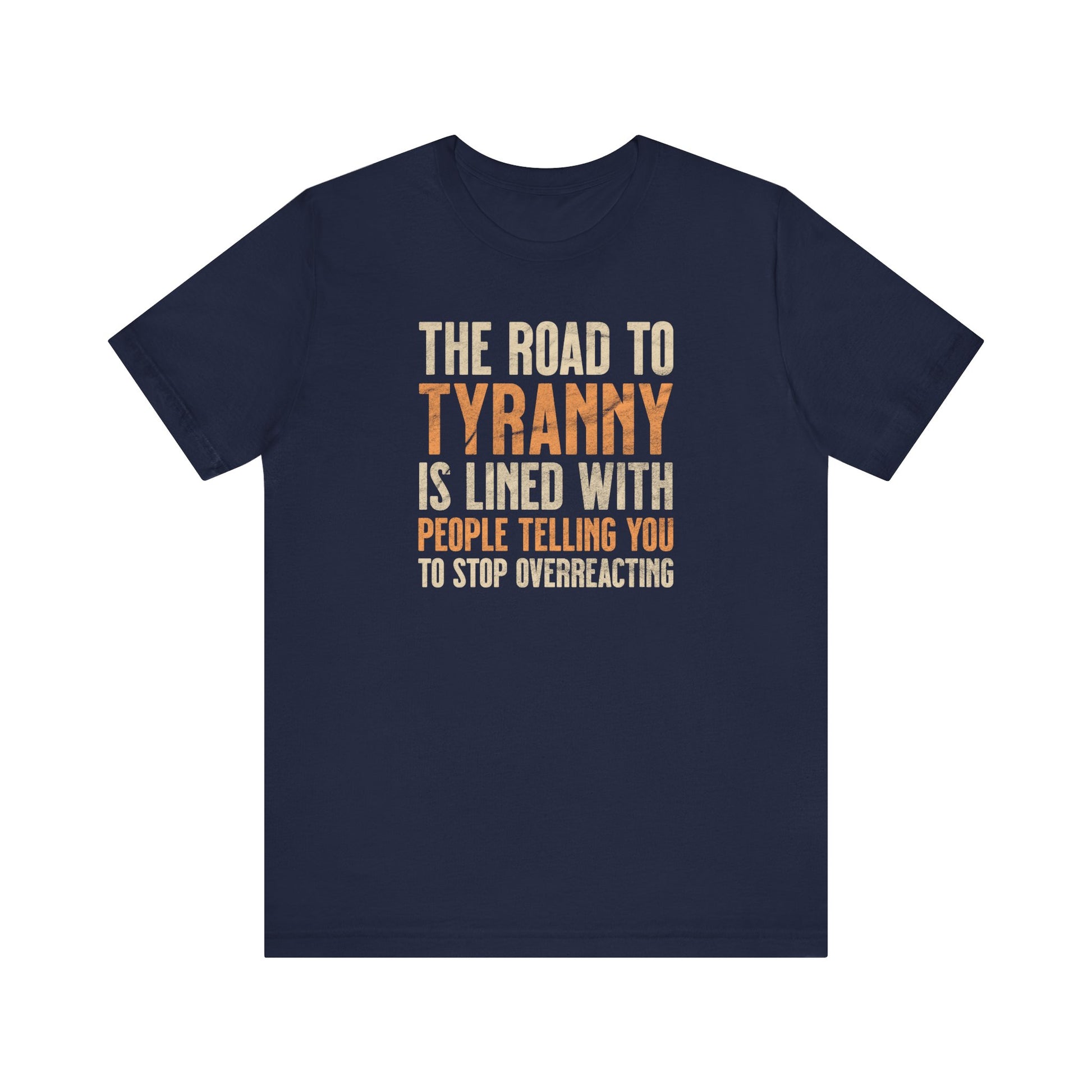 The Road To Tyranny Is Lined With People Telling You To Stop Overreacting t-shirt. This meme-inspired design slaps you right in the face with a reality perspective check.